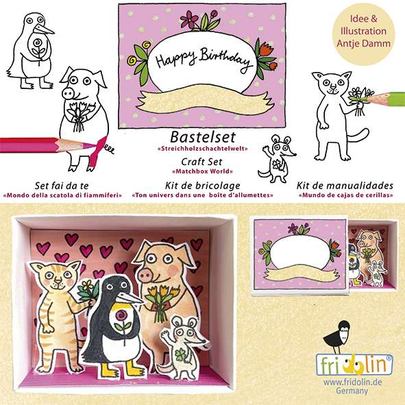 Kreativität ist gefragt, denn du gestaltest die Schachtel und den Inhalt selber. Aber keine Angst: du bekommst Hilfe. Vorlagen und vorgestanzte Figuren unterstützen dich beim Erstellen. Du brauchst diese nur noch auszumalen, zu beschriften und zusammenzustellen. Schon entsteht eine eigene kleine Welt mit niedlichen Figuren.