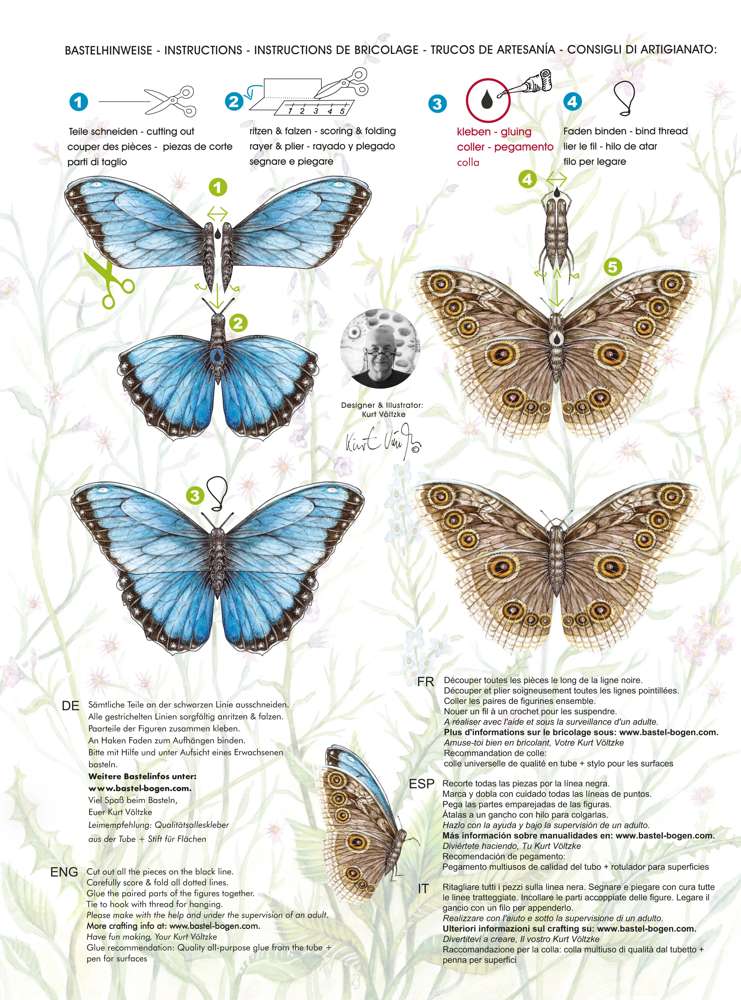 Schwierigkeitsgrad: einfach, anspruchsvolle Formen zum Schneiden, einfache Montage mit Hilfe und unter Aufsicht von Erwachsenen. Bastelzeit: ca. 3 Stunden für den gesamten Bastelbogen, pro Schmetterling ca. 0.5 Stunden.