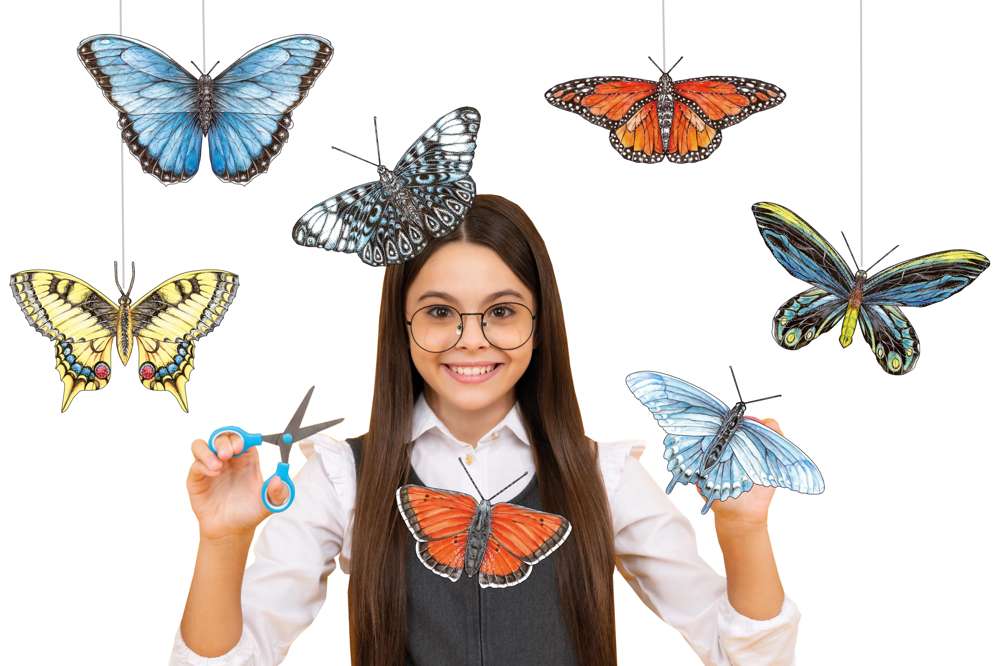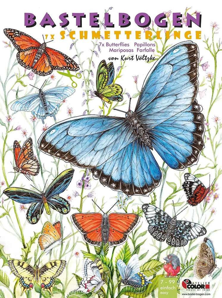 Bastelbogen für Kinder mit Motiv "Schmetterling". Mit: 7 Schmetterlingsarten in verschiedenen Grössen. Ideal zum Schmetterlinge basteln mit Kindern. Geeignet ab 7 Jahren. Schwierigkeitsgrad leicht.