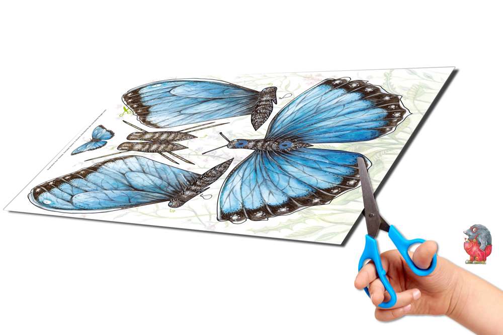 Ausschneiden, Zusammenkleben, Faden knüpfen und fertig sind die 3D grossen Schmetterlinge zum Aufhängen oder zur Dekoration. Liebevoll und detailreich illustriert von Kurt Völtzke fliegen die farbenfrohen Falter durchs Kinderzimmer.