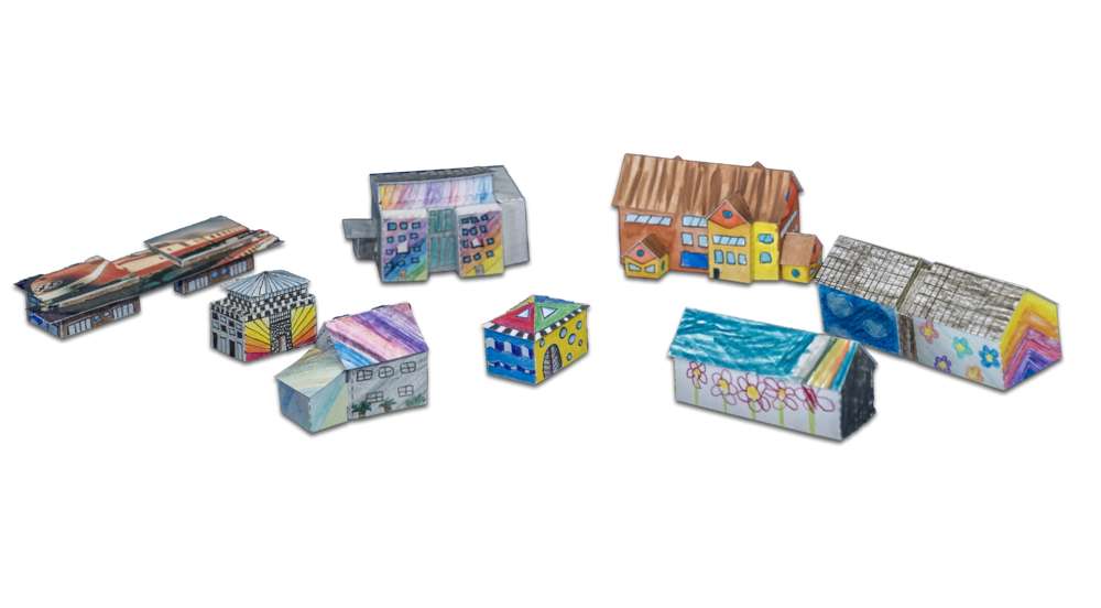 Mit diesem Modellbogen stehen dir acht Häuser zur Verfügung, bei denen lediglich die Form vorgegeben ist (sogenannte «Weiss-Modelle»).