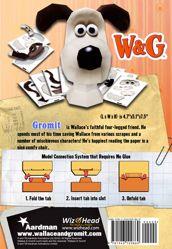 Wiz Head sind aussergewöhnliche 3D Modellbausätze aus Papier. Wiz Head Gromit enthält 21 vorgeschnittene Teile. Ein einzigartiges Konzept, die Modell Köpfe aus Papier sind in zusammengesetztem Zustand ca 20cm gross.
