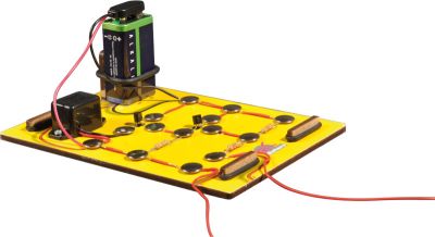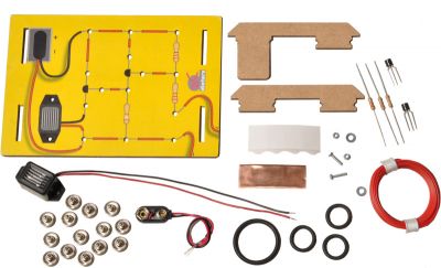 Inhalt: Transistoren, Widerstände, Kabel, Summer, Batterieclip, Kupferblech, doppelseitiges Klebeband, Grundbrett und Anleitung. Die 9-Volt Blockbatterie nicht im Lieferumfang enthalten.