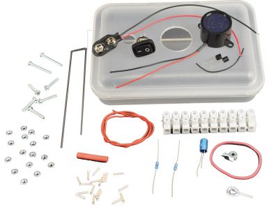 Inhalt: Alarmpiepser, Schalter, Batterieclips, Draht, Kondensator, Widerstände, Transistoren, Stellring, Schrauböse, Schrumpfschlauch, Schrauben und Muttern und Aderendhülsen.