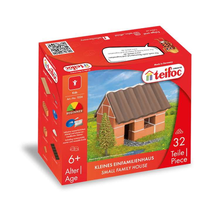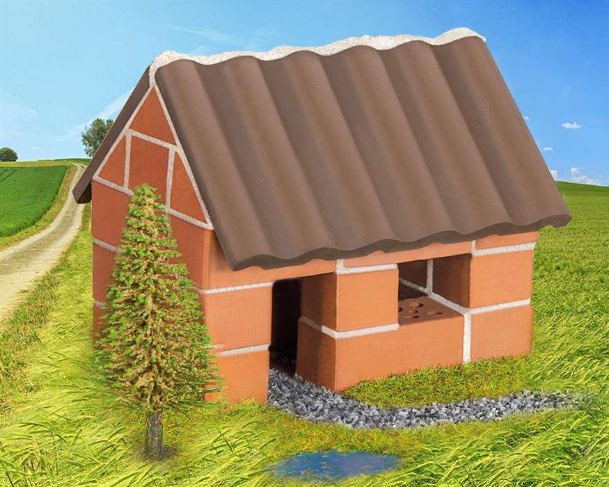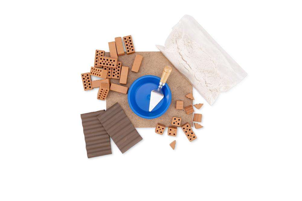 Baue mit echten Ziegelsteinen ein kleines Haus.