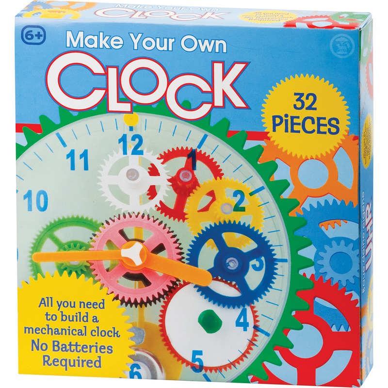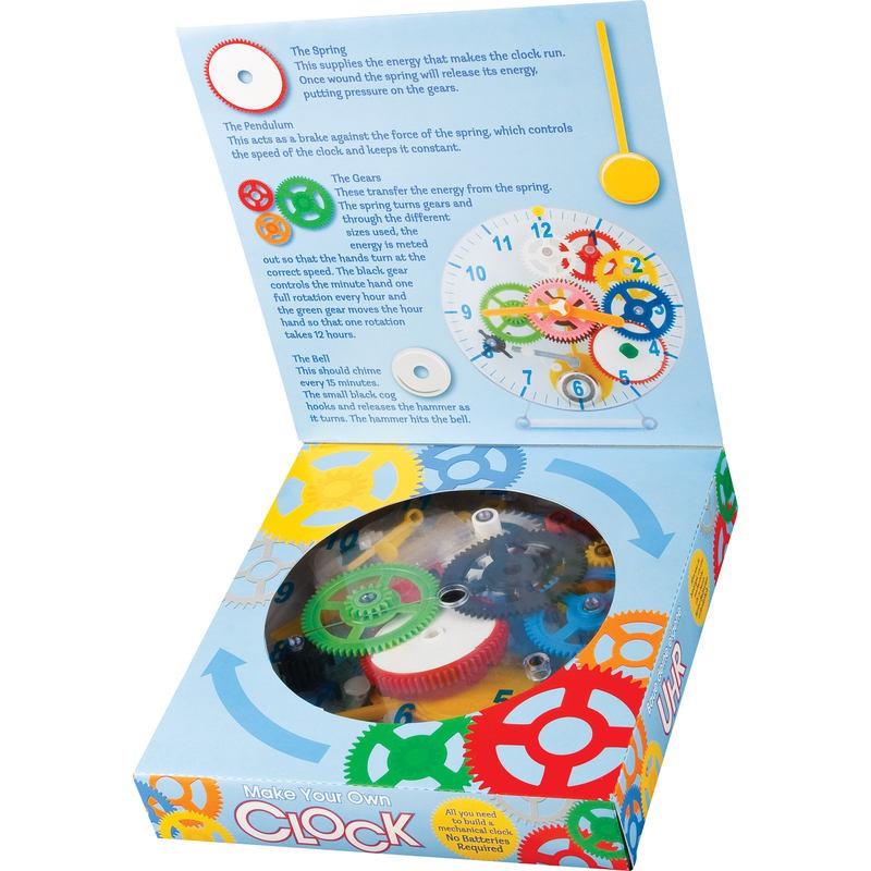Meine eigene Uhr ist ein Uhrenbausatz für Kinder im Grundschulalter. 31 verschieden farbige Teile werden zu einer mechanischen Uhr zusammengebaut, die richtig tick - tack macht!