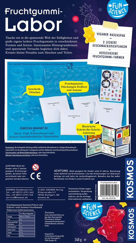 Mit dem «Fruchtgummi Labor - Experimentierkasten» können Kinder leckere, vegane Gummibärchen selber zubereiten. Dabei lernen sie, wie Geliermittel funktionieren und was es mit den Aggregatzuständen auf sich hat.
