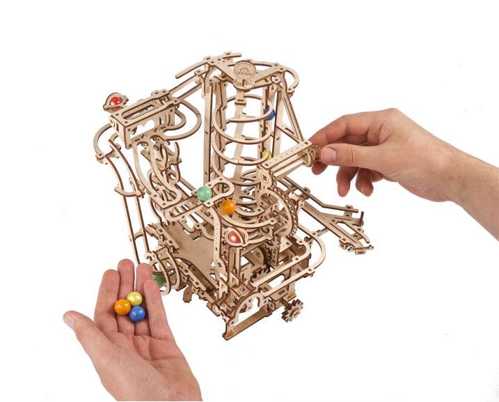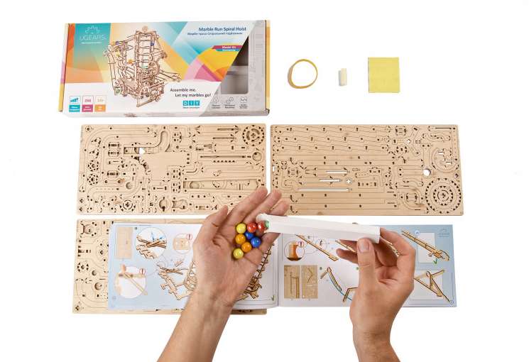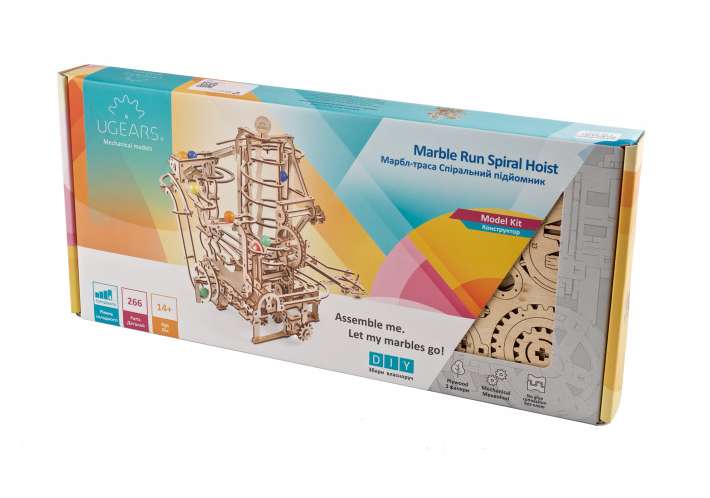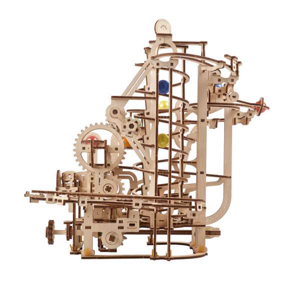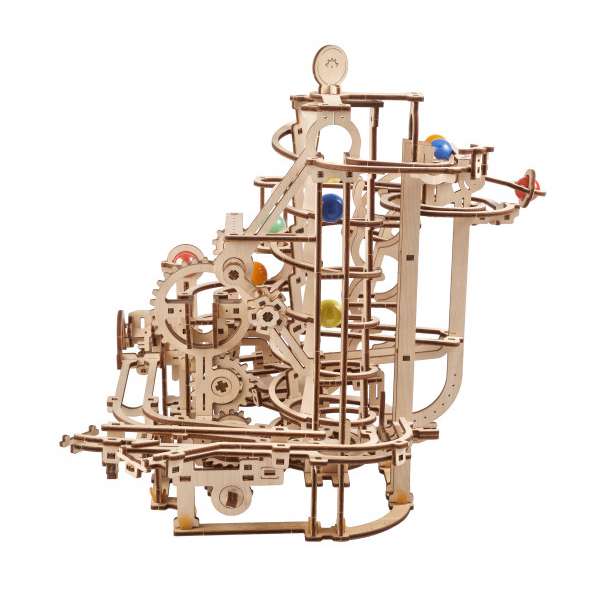 Die Murmelbahn mit Spiralaufzug ist das vierte Modell der Ugears-Serie mit faszinierenden mechanischen Murmelbahnen aus Holz zum Selberbauen.