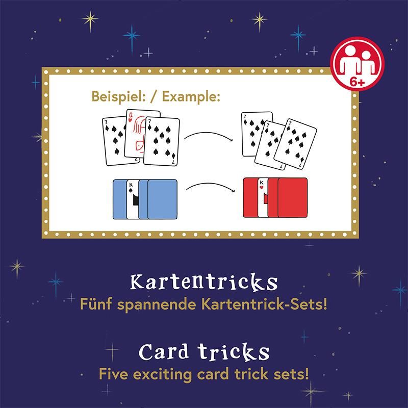Fünf spannende Kartentrick-Sets! Versetze alle deine Freunde in Staunen, indem du viele verschiedene Kartentricks beherrschst. Du kannst Karten verwandeln, sie verschwinden oder wieder auftauchen lassen u. v. m.