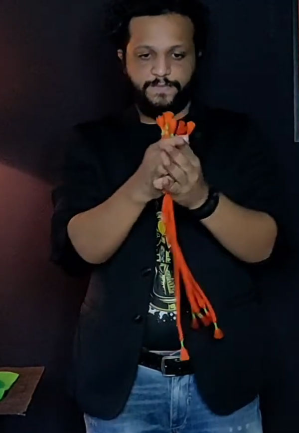 Er zählt die Seile von Hand zu Hand und erklärt, dass er nur 4 für einen Trick benötigt. Also wirft er ein Seil weg. Beim Nachzählen stellt er fest, dass er immer noch 5 Seile übrig hat. Der Zauberer murmelt etwas von einem Zählfehler und wirft wieder ein Seil weg. Aber er hat immer noch 5 Seile übrig.