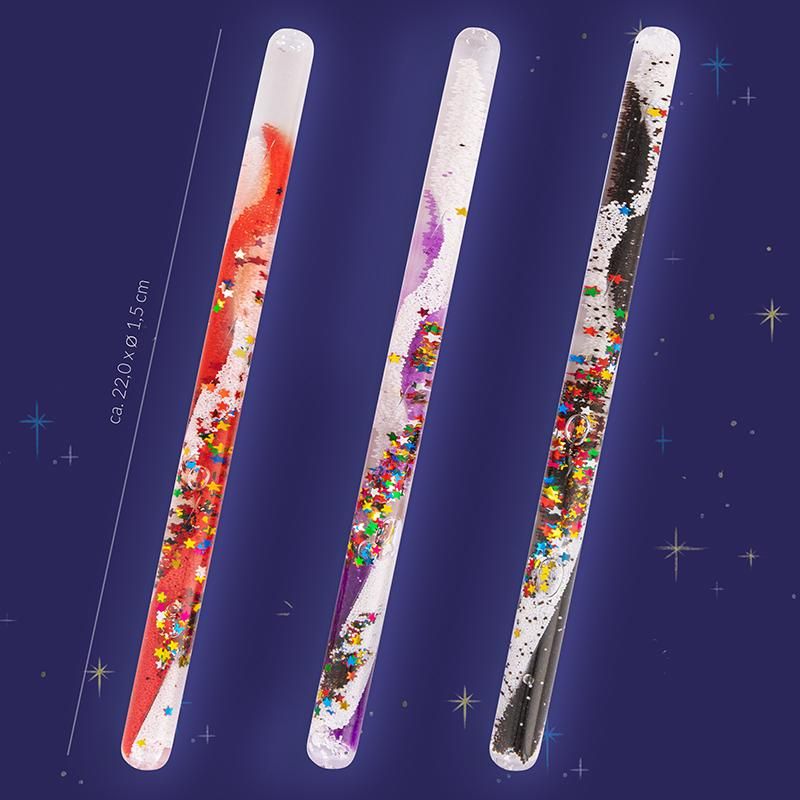 Die bunten glitzernden Elemente schweben bei Bewegung spiralförmig durch den Zauberstab und wirken so besonders magisch.