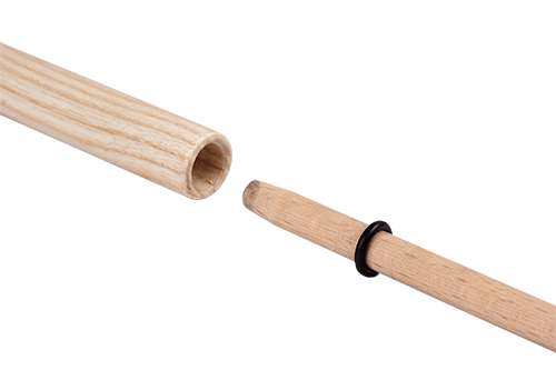 Das dünnere Ende mit abgerundeter Spitze wird mit einem Gummiring im Griff fixiert. Der Stab kann so bei Bedarf wieder zerlegt werden.
