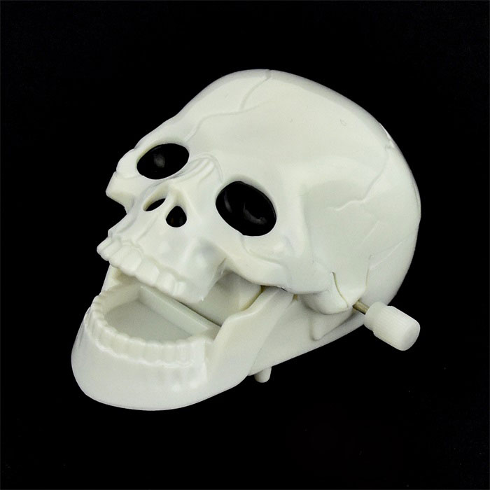 Totenkopf zum Aufziehen, er klappert dann mit dem Gebiss. Furchterregend, aber lustig. An der Seite ragt ein knochenähnlicher Knopf aus dem Ohr. Mit diesem wird das Uhrwerk aufgezogen.