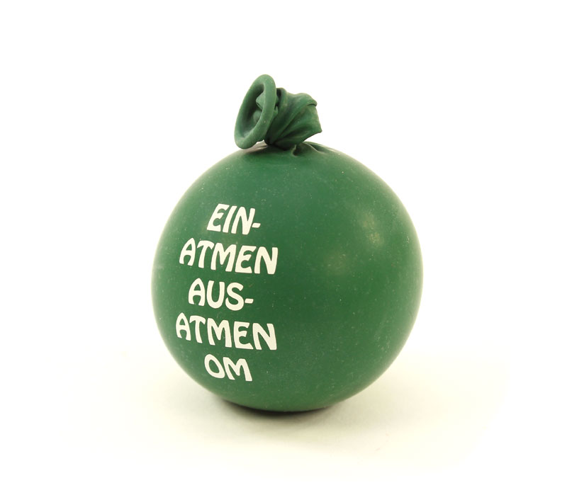 Eine stabile robuste Luftballonhülle ist mit weicher Bioknete gefüllt und lädt zum Drücken, Quetschen, Kneten, Ziehen ein. Der knetige, geschmeidige Stressball hat vorne den Aufdruck "Einatmen - Ausatmen" sowie die heilige Silbe "Om" und hinten ein Bild einer Person in Yoga-Haltung.