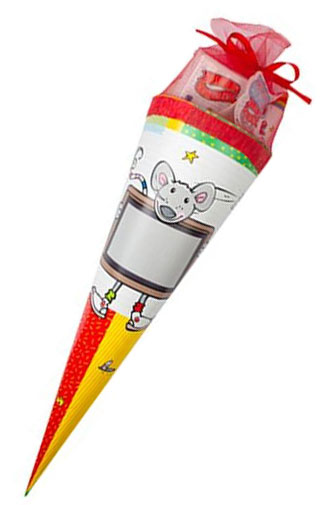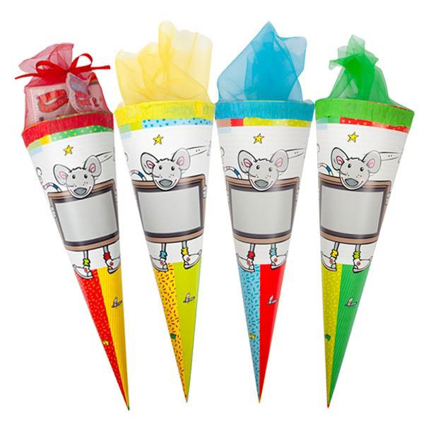 Diese Schultüte aus stabilem Karton mit farbigem Tüll zum Verschliessen kann mit gekauften oder selbstgefertigten Kleinigkeiten gefüllt werden und im Namensfeld beschriftet werden.
