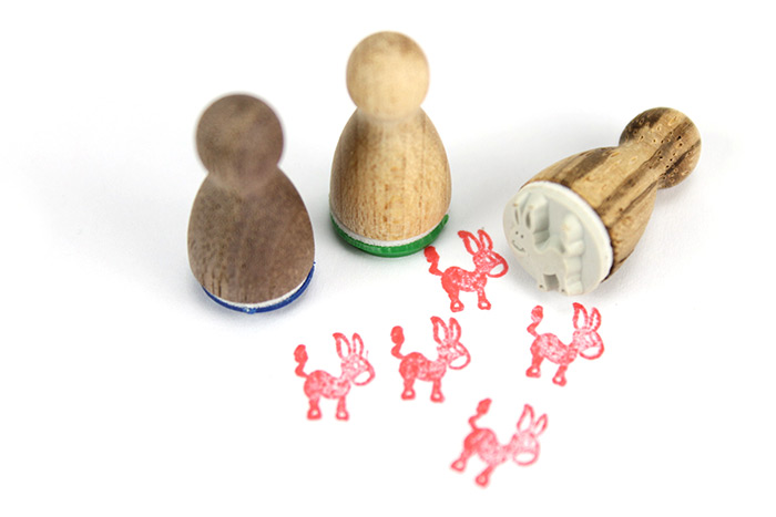 Die liebevoll gestalteten Ministempel aus Holz sehen aus wie Spielfiguren und haben auch diese Grösse. Mit den süssen Motiven lassen sich kleine Symbole stempeln.