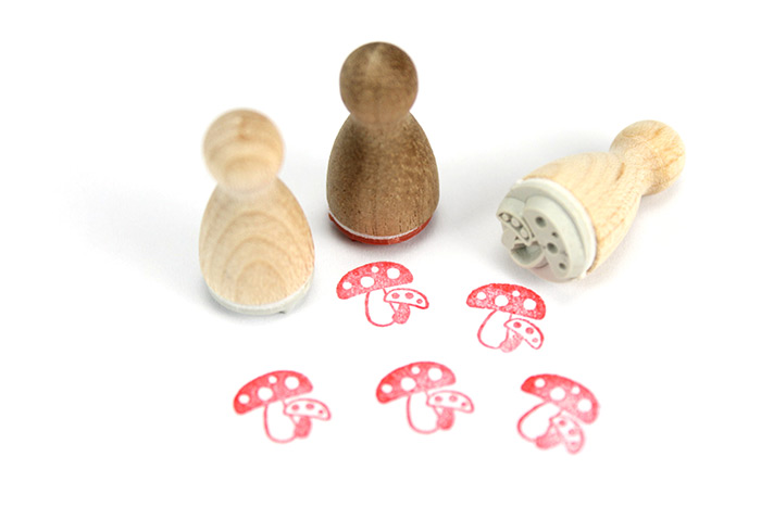 Die liebevoll gestalteten Ministempel aus Holz sehen aus wie Spielfiguren und haben auch diese Grösse. Mit den süssen Motiven lassen sich kleine Symbole stempeln.