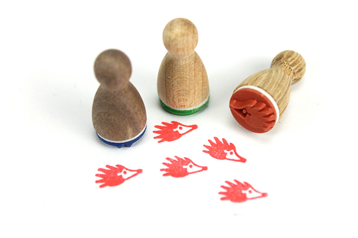 Die liebevoll gestalteten Ministempel aus Holz sehen aus wie Spielfiguren und haben auch diese Grösse. Mit den süssen Motiven lassen sich kleine Symbole stempeln.