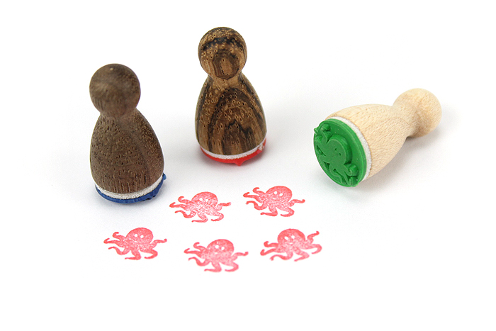Die liebevoll gestalteten Ministempel aus Holz sehen aus wie Spielfiguren und haben auch diese Grösse. Mit den süssen Motiven lassen sich kleine Symbole stempeln.
