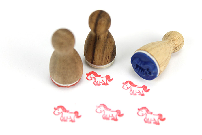 Die liebevoll gestalteten Ministempel aus Holz sehen aus wie Spielfiguren und haben auch diese Grösse. Mit den süssen Motiven lassen sich kleine Symbole stempeln.