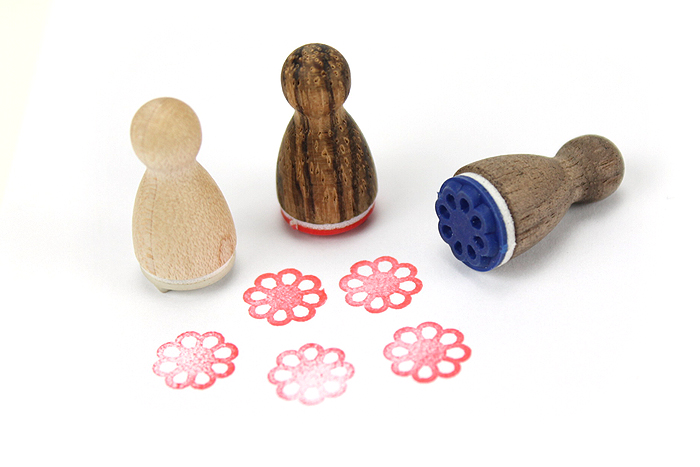 Die liebevoll gestalteten Ministempel aus Holz sehen aus wie Spielfiguren und haben auch diese Grösse. Mit den süssen Motiven lassen sich kleine Symbole stempeln.