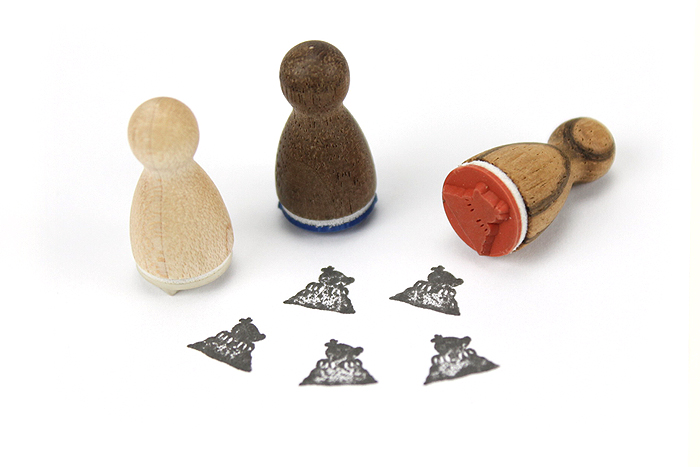 Die liebevoll gestalteten Ministempel aus Holz sehen aus wie Spielfiguren und haben auch diese Grösse. Mit den süssen Motiven lassen sich kleine Symbole stempeln.