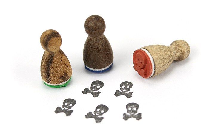 Die liebevoll gestalteten Ministempel aus Holz sehen aus wie Spielfiguren und haben auch diese Grösse. Mit den süssen Motiven lassen sich kleine Symbole stempeln.