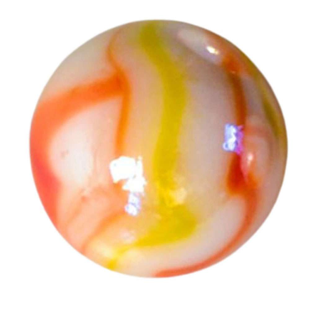 Glasmurmel mit dem Namen Gelato. Weisse Murmel mit gelben und orangenen Streifen und einem Durchmesser von 35 Millimetern. Herstellungsbedingt kann der Durchmesser nicht ganz exakt bestimmt werden.