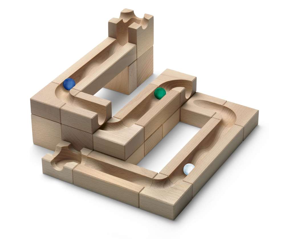 Zusatzset für Cuboro Kugelbahnen. Sorgt für schwungvolle Bahnen. Eigenständig spielbar oder kombinierbar mit anderen Cuboro Sets.