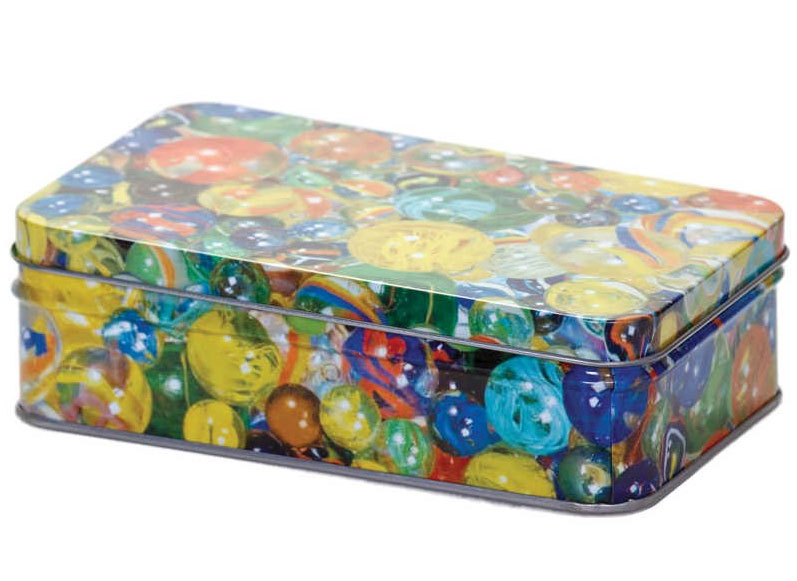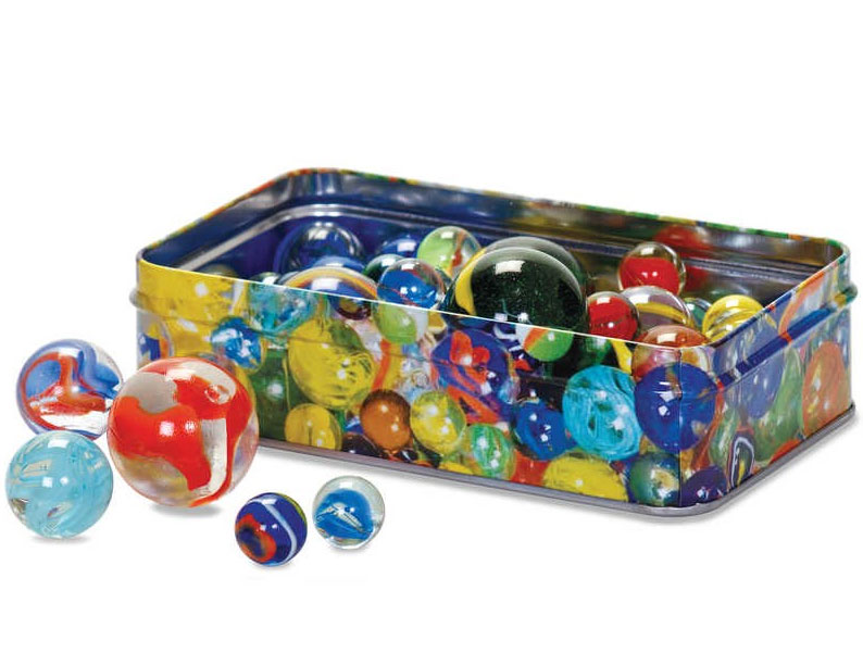 Dekorative Metallbox gefüllt mit 60 Glasmurmeln.