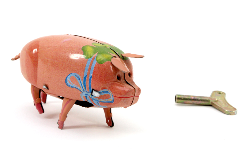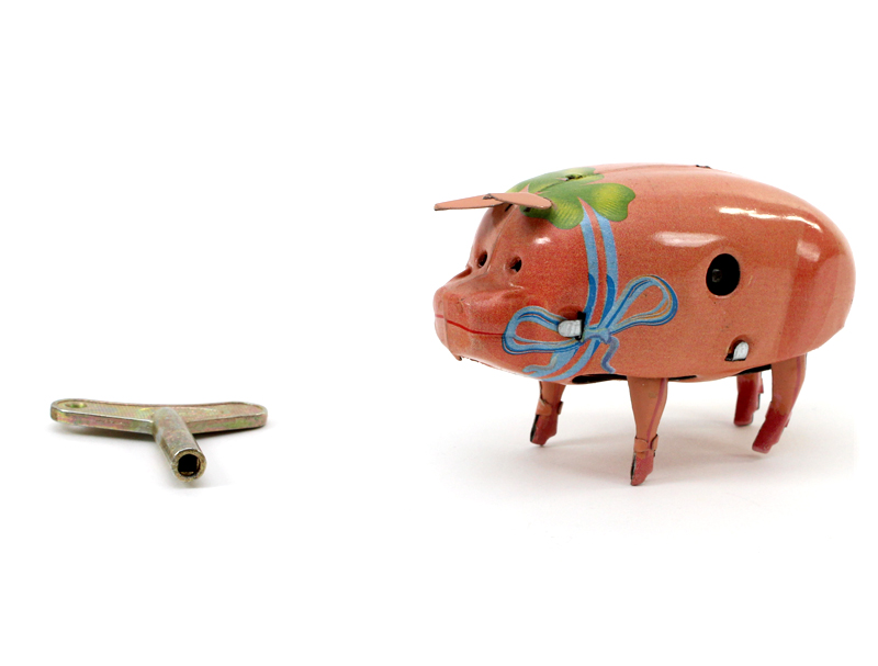 Glücksschwein Polly, es ist aus Blech gefertigt und kann mit dem beigelegten Schlüssel aufgezogen werden. Dann wackelt es lustig mit einem einzigarten 4-Bein-Antrieb über den Tisch.