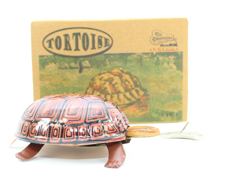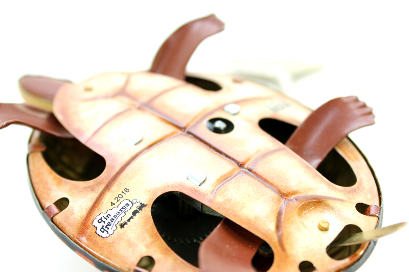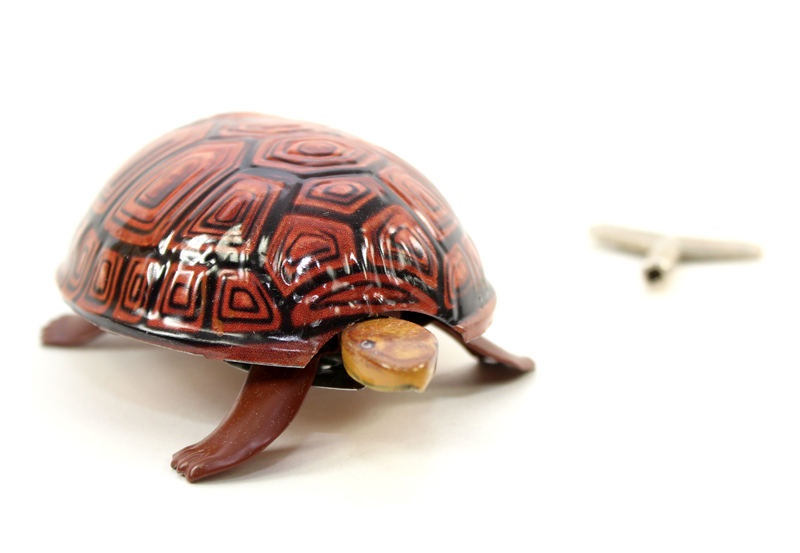 Das Federwerk der Schildkröte an der Unterseite wird mittels eines beigelegten Schlüssels aufgezogen und die Schildkröte setzt sich behäbig in Bewegung.
