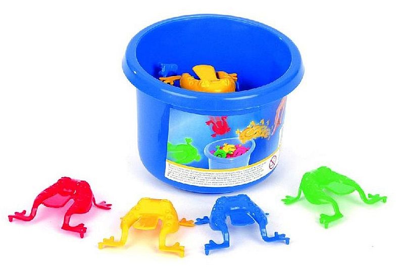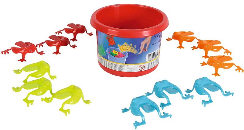 Ziel des kinderleichten und immer wieder lustigen Frosch-Hüpfspiels: Wer schafft es als erster, seine Frösche in den Eimer zu schnippen?