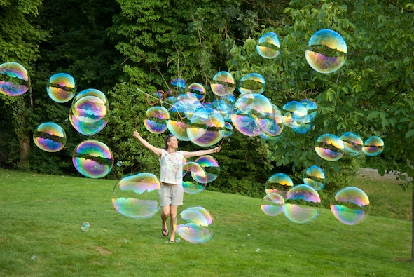 Gigantisch grosse Seifenblasen von bis zu 10 Meter Länge und einem Meter Durchmesser können mit dem Produkt Zauberseife verwirklicht werden.