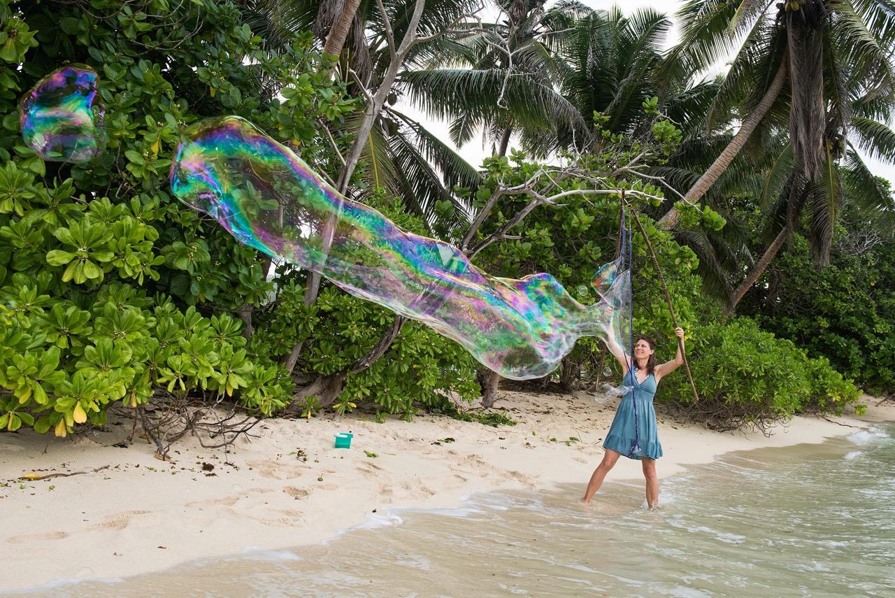 Gigantisch grosse Seifenblasen von bis zu 10 Meter Länge und einem Meter Durchmesser können mit dem Produkt Zauberseife verwirklicht werden.