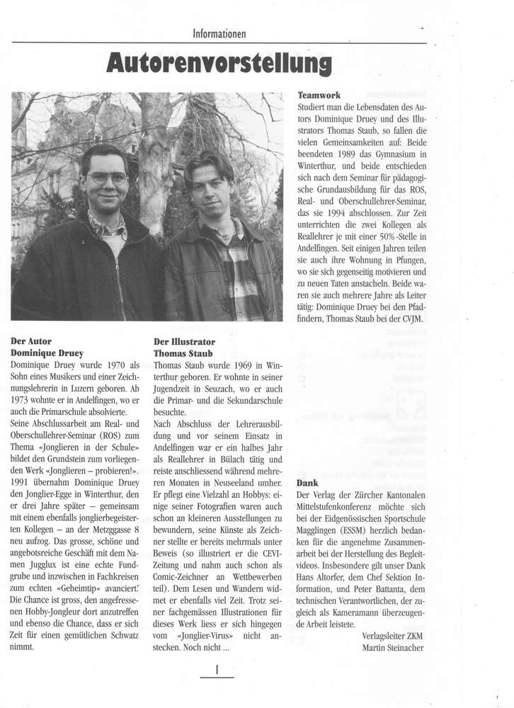 1994 verfasste Dominique Druey, Mitbegründer und Mitinhaber vom Jugglux als Abschlussarbeit am Real- und Oberschullehrerseminar die erste Version dieses Lehrmittels. Auf Anfrage des ZKM (Zürcher Kantonaler Mittelstufenverlag) überabeitete er das Werk und drehte dazu kurze Filmsequenzen.