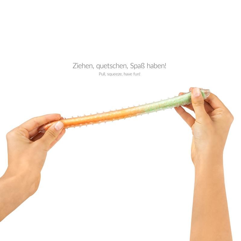 Du kannst diese langen Würmer ziehen, quetschen und knoten. Sie sind mit Sand in zwei Farbkombinationen gefüllt. Das Spielen mit dem Sandwurm ist ein taktiles Erlebnis.