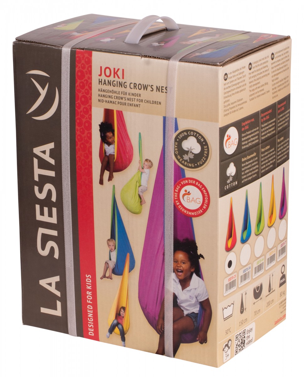 Der Baumwollstoff ist robust und pflegeleicht. Ein weiches und extra grosses Kissen sorgt im JOKI für zusätzlichen Komfort. Das Kissen ist in die Hängehöhle integriert und kann mit Hilfe eines Reissverschlusses vor dem Waschen herausgenommen werden.