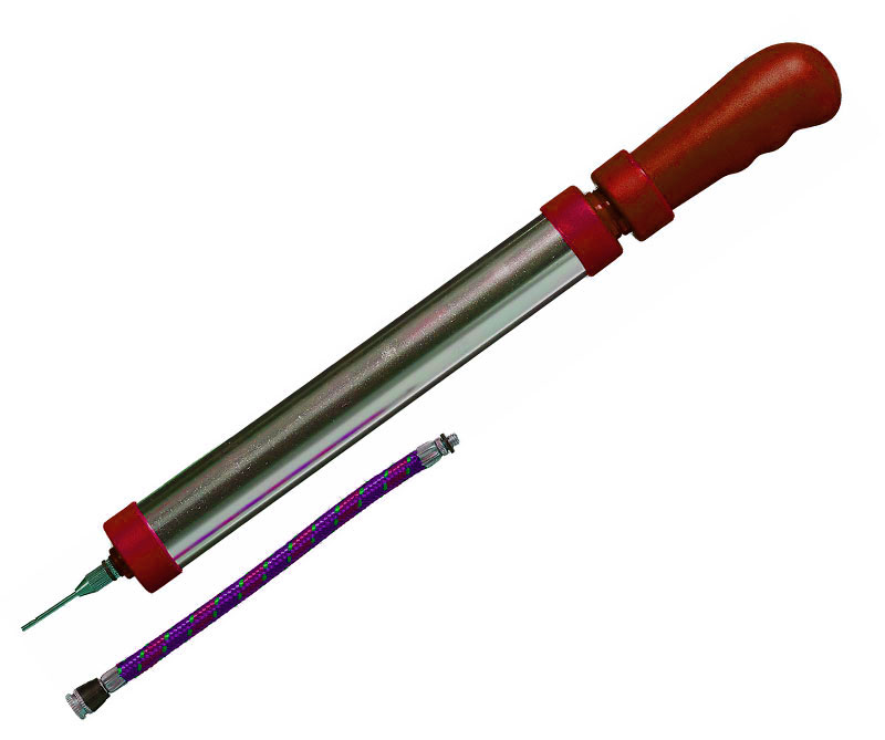Die Ventilnadel ist sicher im Griff integriert. Der Doppelschub sorgt für maximale Luftzufuhr. Dazu wird ein Adapter (Schläuchlein) für gängige Fahrradventile mitgeliefert.