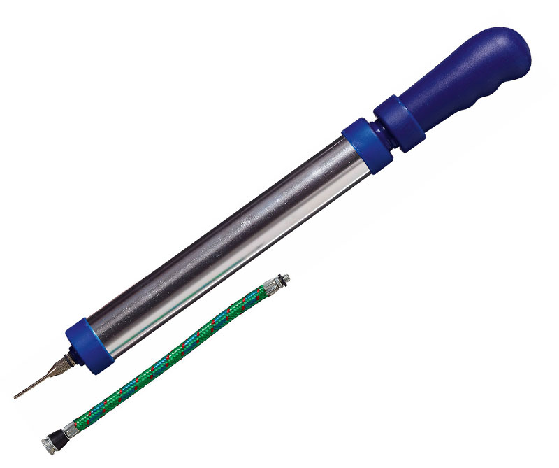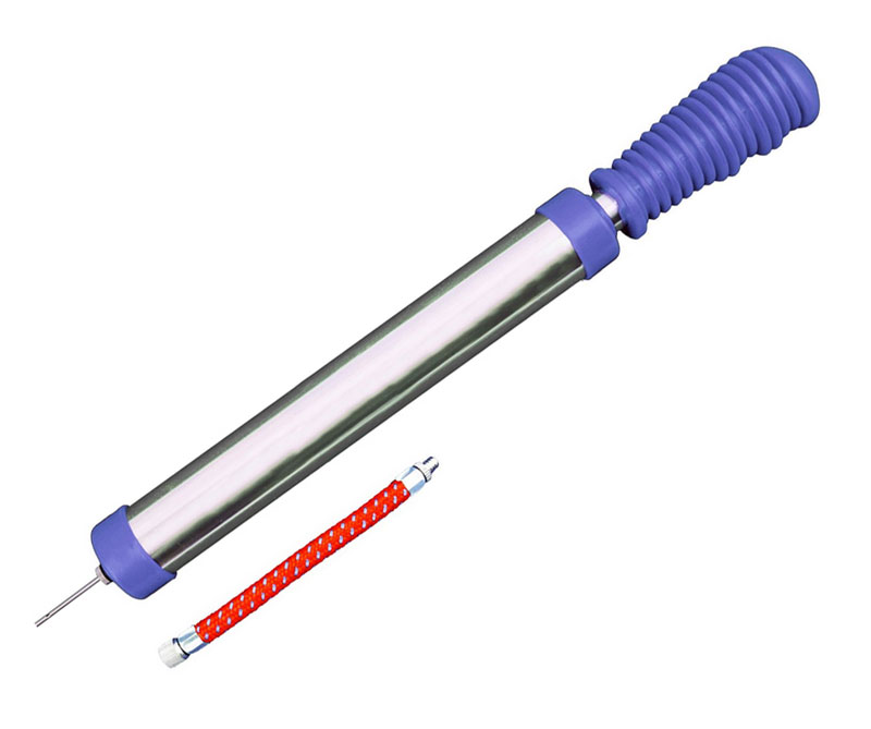 Zwei-Wege-Ballpumpe aus Aluminium mit blauem Griff und verchromter Ventilnadel. Sie ist geeignet für alle gängigen Ballarten mit Nadelventil, wie Fussball, Handball, Volleyball usw.