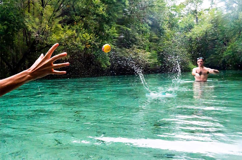 Der Waboba Ball hüpft auf dem Wasser. Wirf ihn wie einen Sprungstein und er schiefert oder hüpft zu deinen Spielpartner.