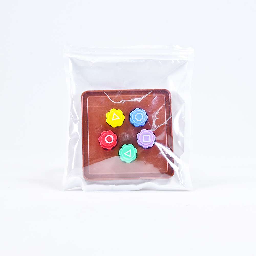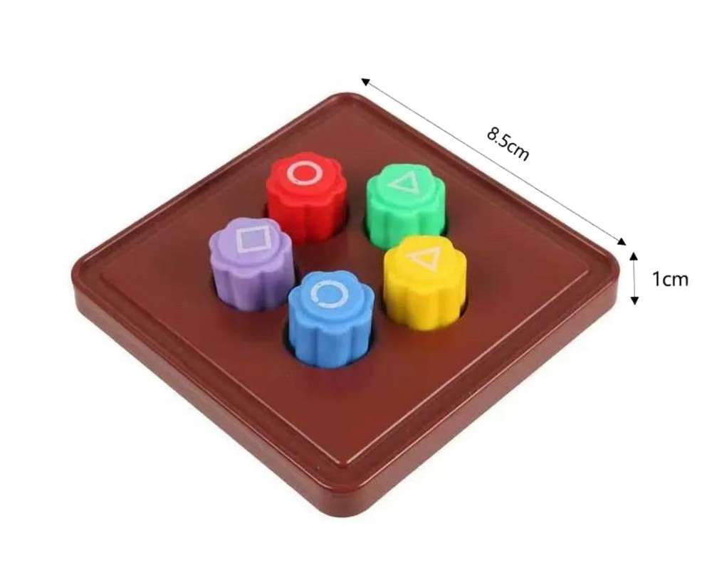Gonggi ist ein koreanisches Traditionsspiel, neuerdings bekannt als Spiel aus Squid Game. 5 farbige Spielsteine auf braunem Kunststoff-Brett.