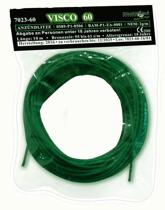 Visco 60 ist eine pyrotechnische Zündschnur für viele professionelle Möglichkeiten. Sie brennt mit offener Flamme und sprüht Funken. Einzelne Stränge können durch Verknoten miteinander verbunden werden. Durchmesser ca. 2 mm, wasserabweisend und sehr genaue Brenndauer. Sie darf nur mit funkenhemmenden Werkzeugen bearbeitet und in trockerener Umgebung verwendet werden.