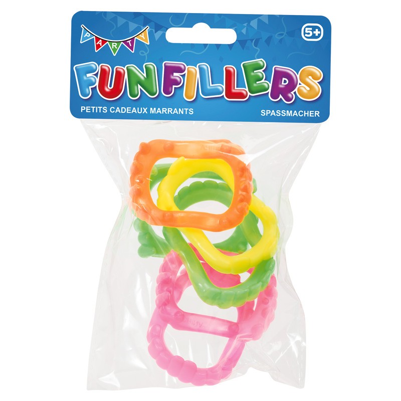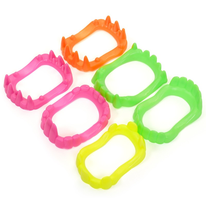 Monster Zähne, Vampirzähne und andere lustige Zähne in vier Neon-Farben.