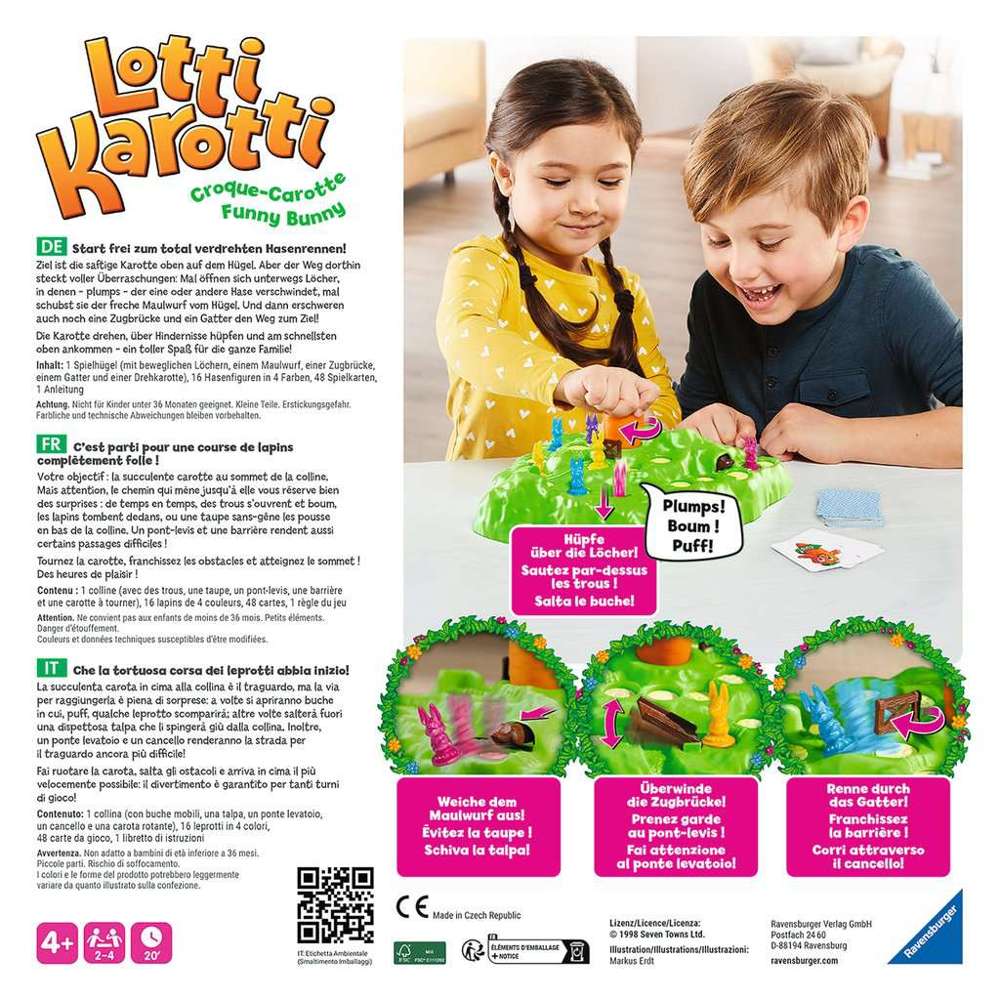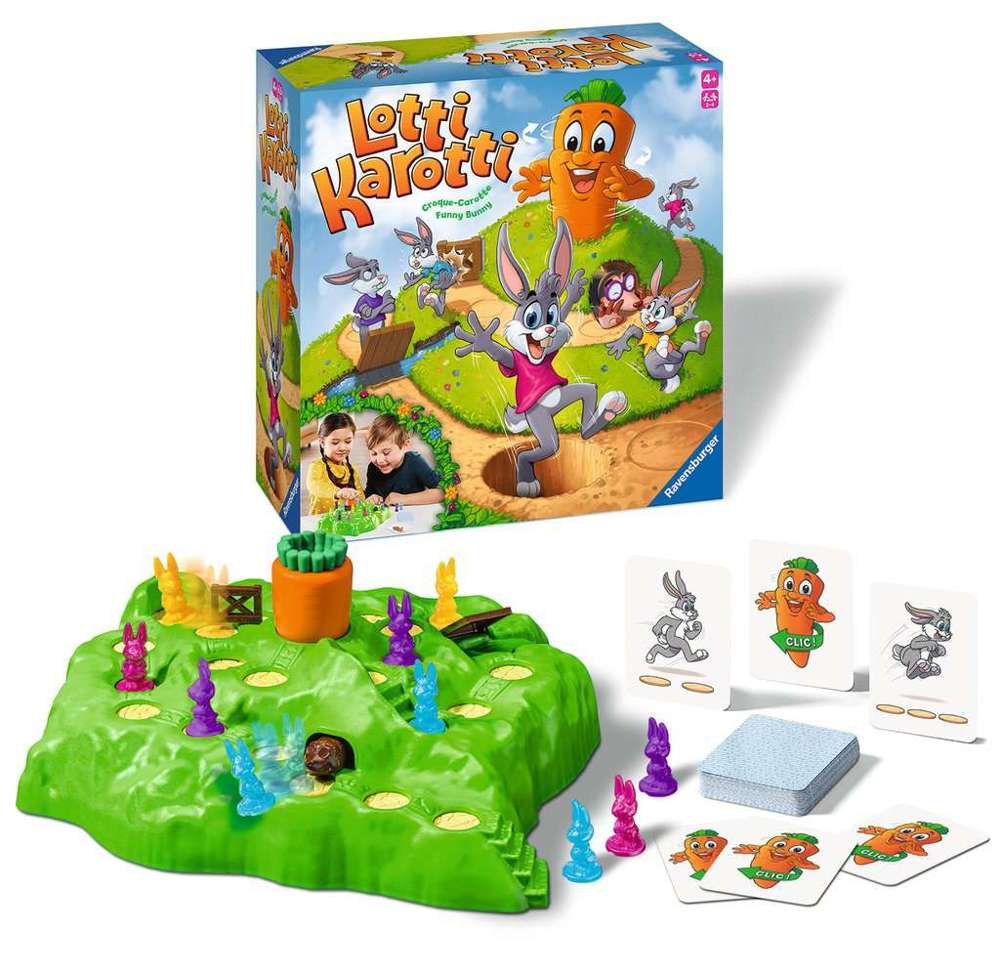 Lotti Karotti ist ein total schräges Hasenrennen. Die Spieler decken die Karten auf, um mit ihren Hasen als erster die Karotte auf dem Berg zu erreichen. Der Weg dorthin steckt voller Gefahren, Hindernisse und Überraschungen.