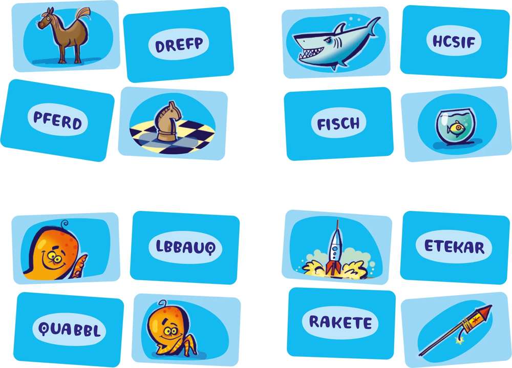 Findet Paare! Bei diesem rasanten Karten Spiel müssen vorwärts und rückwärts geschriebene Wörter und Bildkarten einander zugeordnet werden.
