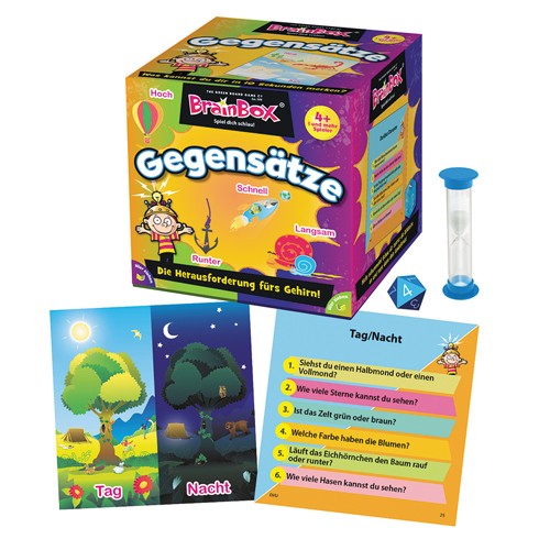 Bei Gegensätze lernen die Kinder die zwei extremen Eigenschaften eines Themas kennen, Auf jeder Karte sind zwei Bilder zu sehen, die einen Gegensatz zeigen - zum Beispiel Heiss/Kalt, Gross/Klein oder Tag/Nacht. Kindergerechte. fantasievolle Illustrationen mit einprägsamen Szenen zu den einzelnen Worten visualisieren die Welt der Gegensätze lebendig und erkennbar.