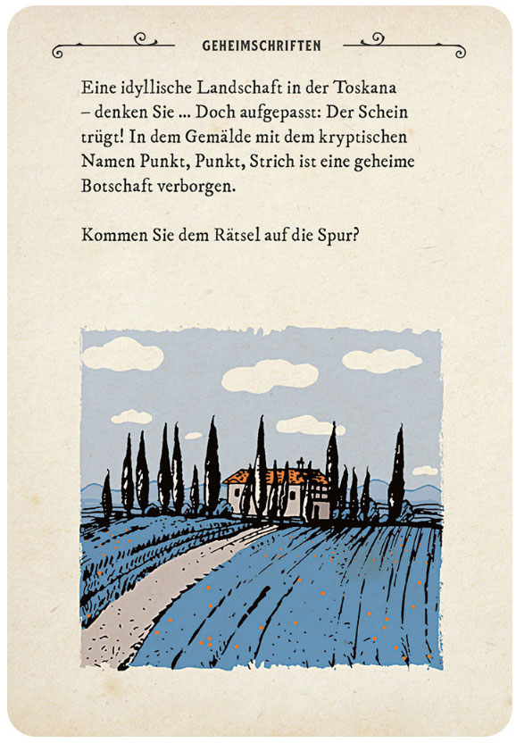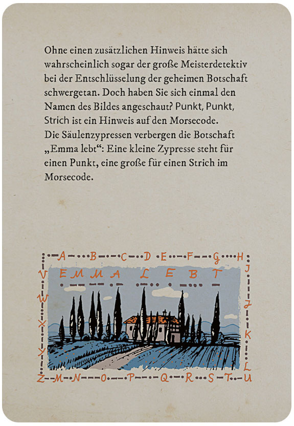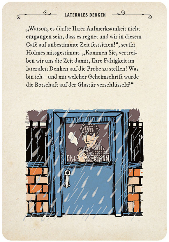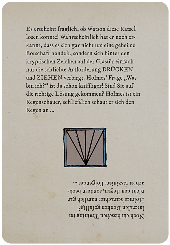 Um auf die richtige Lösung dieser Denksportaufgaben zu kommen, benötigt es anderes Denken, logisches Denken ist zwar nötig, aber manchmal wird inverses Denken benötigt. Es muss akribisch genau hingeschaut, akkurat kombiniert und exakte Schlussfolgerungen gezogen werden. Nur so kann das Rätsel gelöst werden. Falls du nicht weiterkommst: Zusätzliche Hinweise können die Denkknoten lösen und Lösungsansätze liefern. Auf der Rückseite der Karte findet sich die Lösung, die zum Teil bildlich gestaltet wurde.