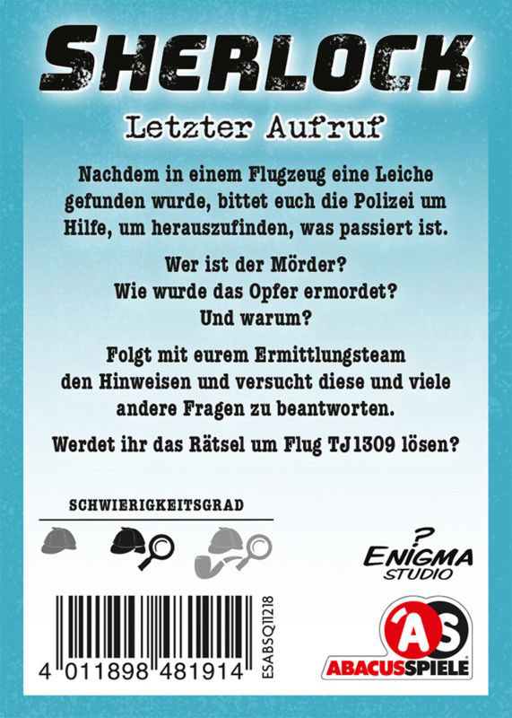 Sherlock ist eine neue kooperatives Kriminal-Spielsystem mit spannenden Fällen mit unterschiedlichem Schwierigkeitsgraden. In der Gruppe wird gemeinsam diskutiert, wie sich der Fall ereignet haben könnte. Die Karten liefern hierzu nach und nach Informationen, aber nicht alle sind relevant für die Lösung.