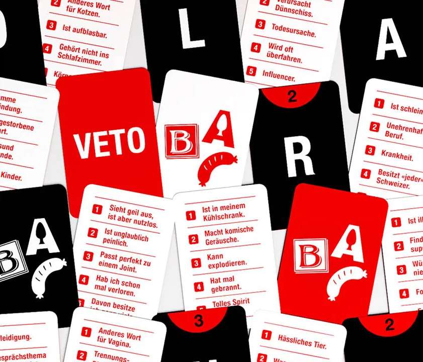 Was fällt dir ein zu Sexspielzeug, Wurstsorte oder Fluchwort? Oder zu «Bezeichnung für Brüste», «Ist aufblasbar», «Wird oft überfahren»? Der Anfangsbuchstabe wird dabei vorgegeben. Für 3-8 Personen. Empfohlen ab 16 Jahren.